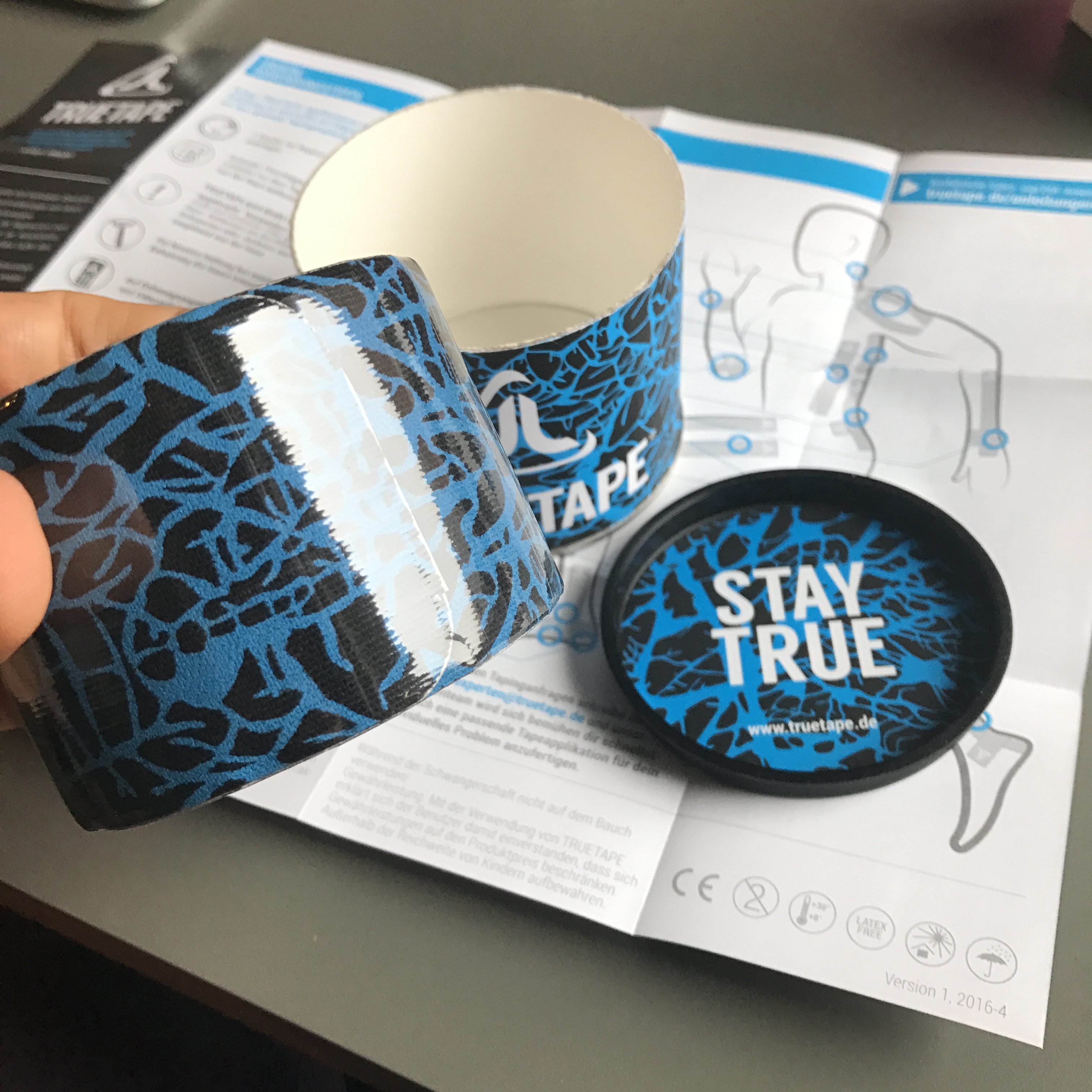 Wir nutzen für das Tapen die Pre-Cut Tapes von True Tape. Der Vorteil bei diesen Kinesio Tapes ist, dass die Streifen vorgeschnitten sind und an den Ecken bereits abgerundet und somit besser kleben. Die Tapes von True Tape lösen sich nicht so schnell wie die von manch anderen Billigherstellern. Die Klebe-Qualität und Elastizität von Tapes ist insbesodere für Sportler wichtig, denn sie müssen hohen Belastungen standhalten. Da versagen leider die meisten 7€ Tapes aus dem Drogeriemarkt. Es gibt Sie in drei verschiedenen Ausführungen. Die Hauptunterschiede der verschiedenen Editionen ist das Material. Die Cotton und Design Edition sind beide aus Baumwolle. Die Design Editions sind eine Limited Edition der Cotton Edition. Die Athlete Edition ist aus einem synthetischen Material. Die Tapes sind dünner, haben mehr Elastizität und passen sich noch besser an die Haut an. Dadurch haben sie eine längere Haltbarkeit und sind besonders für Sportler die richtige Wahl.