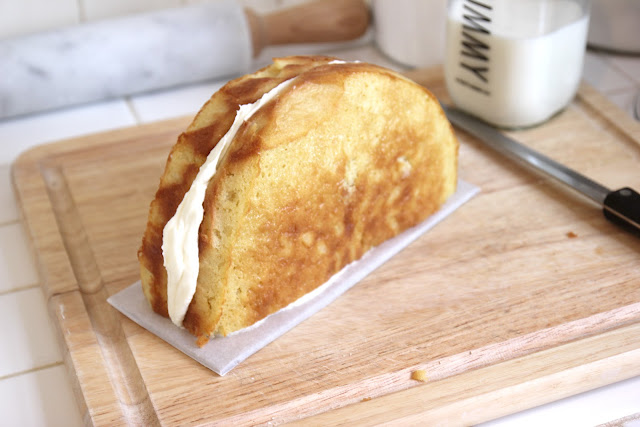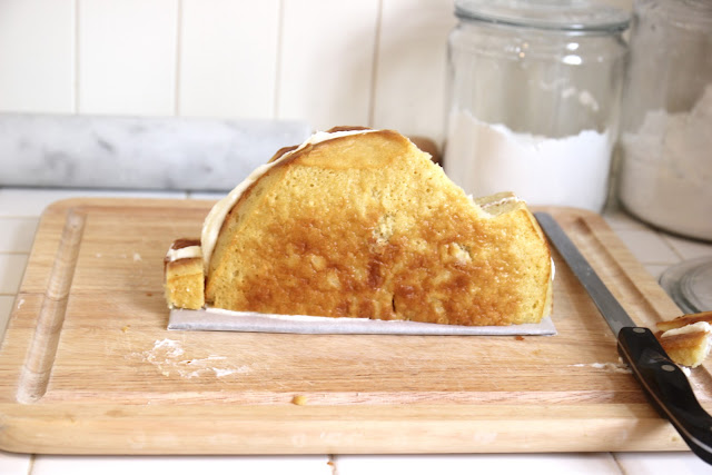 - Dann den kuchen aus der Form nehmen und halbieren.